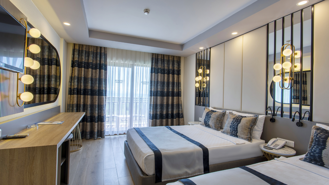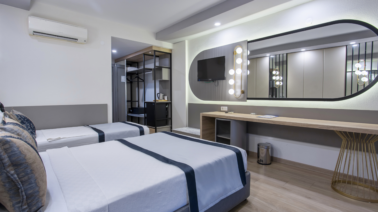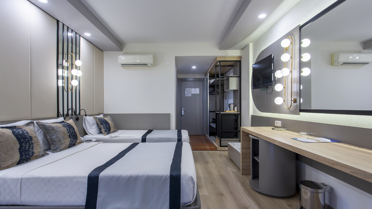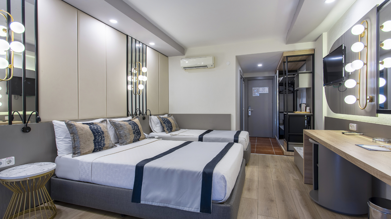 Our standard rooms, designed with the idea of hosting our guests in the best way, are 28 m2. Our rooms are designed as comfortable 1 double bed, 1 single bed, 1 sofa bed. In our rooms, air conditioning, telephone, television, mini bar, balcony, safety deposit box are at your disposal for a pleasant and peaceful holiday.